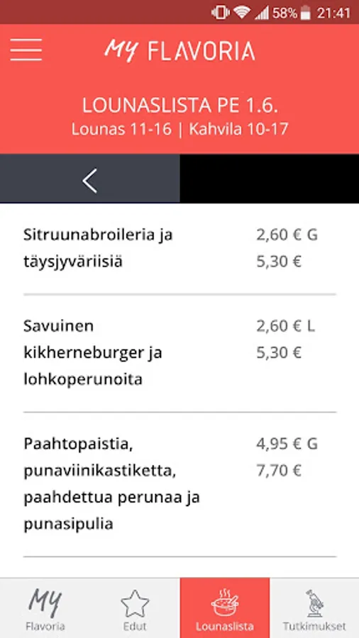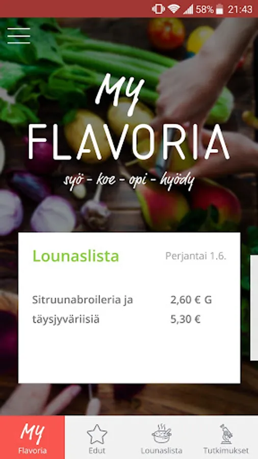Through the app, customers can gain insights into their lunch, its quantity and nutritional values. MyFlavoria™ also informs you of the lunch menu, currently running research programs and tastings, as well as the results of past research.