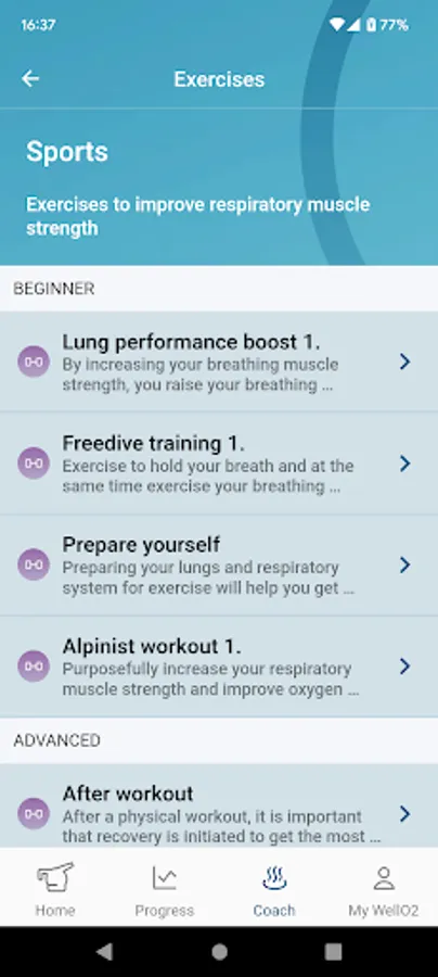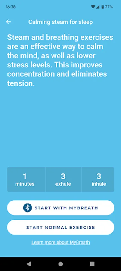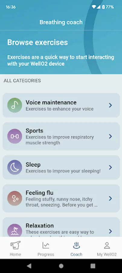 The MyBreath smart mouthpiece works with the WellO2 app and is used like a normal WellO2 mouthpiece. The app offers a wide range of exercises to suit different needs, such as relieving nasty cold symptoms, strengthening your breathing muscles, conditioning your voice before an important performance or calming your mind before bedtime. A wide range of exercises makes WellO2 breathing even more exciting!