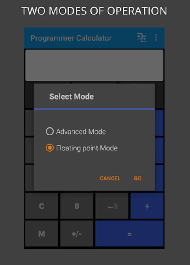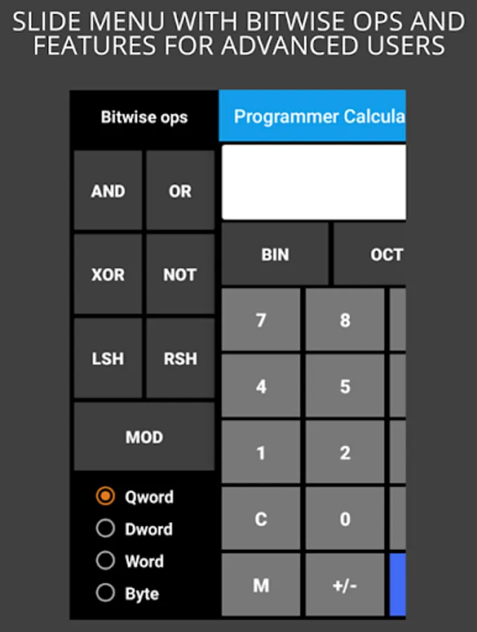 - Advanced mode added, which allows QWORD (64-bits), DWORD (32-bits), WORD (16-bits) and BYTE (8-bits) settings and negative numbers. If you need floating point numbers, tap the options button in the top toolbar, tap mode and select "Floating point mode".