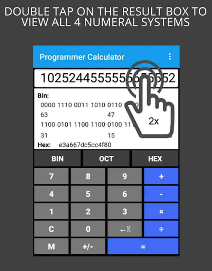 Programmer Calculator is a simple and easy-to-use calculator especially designed for programmers. You can convert numbers from and to all different numeral systems (decimal, binary, octal and hexadecimal). It also provides the basic calculator functions for all 4 numeral systems.