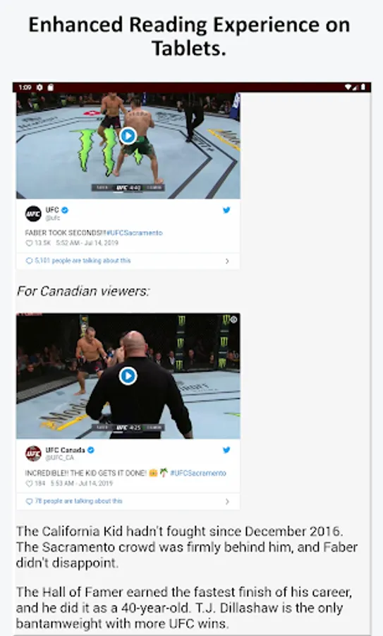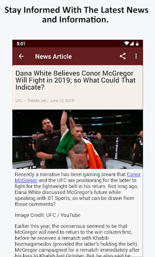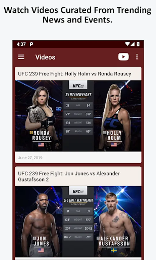 -- A constant stream of trending UFC and MMA news articles published by sources from all around the web and delivered to you, so you don’t have to spend time sorting through isolated sources.