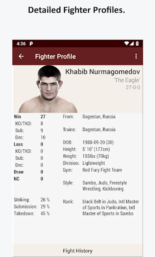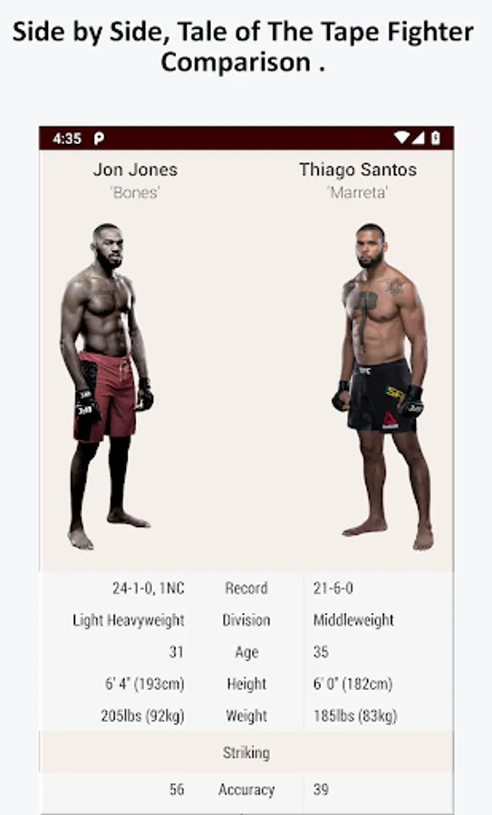 -- List of fighter stats, bio’s and career profiles, with unique sets of info that have been designed to be exactly what UFC fans need to know, allowing you to accurately compare fighters by skill sets and fight history.