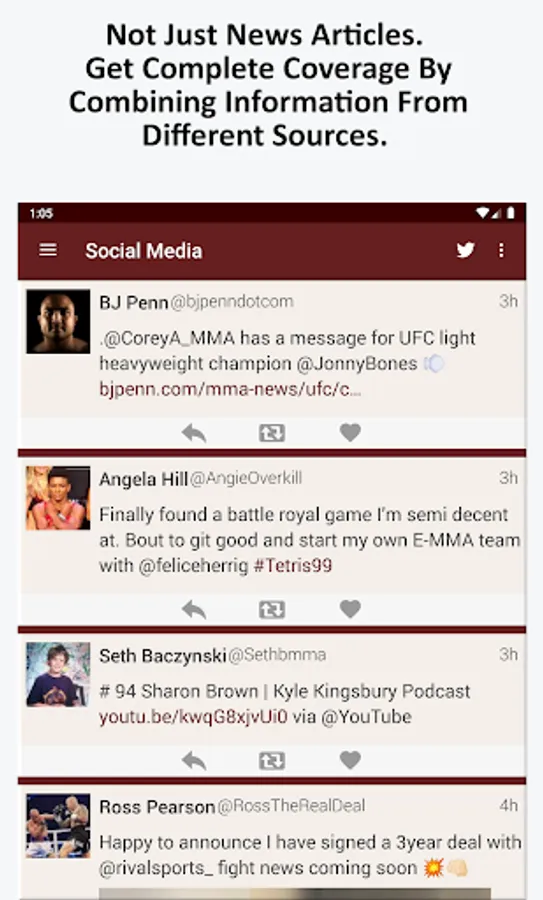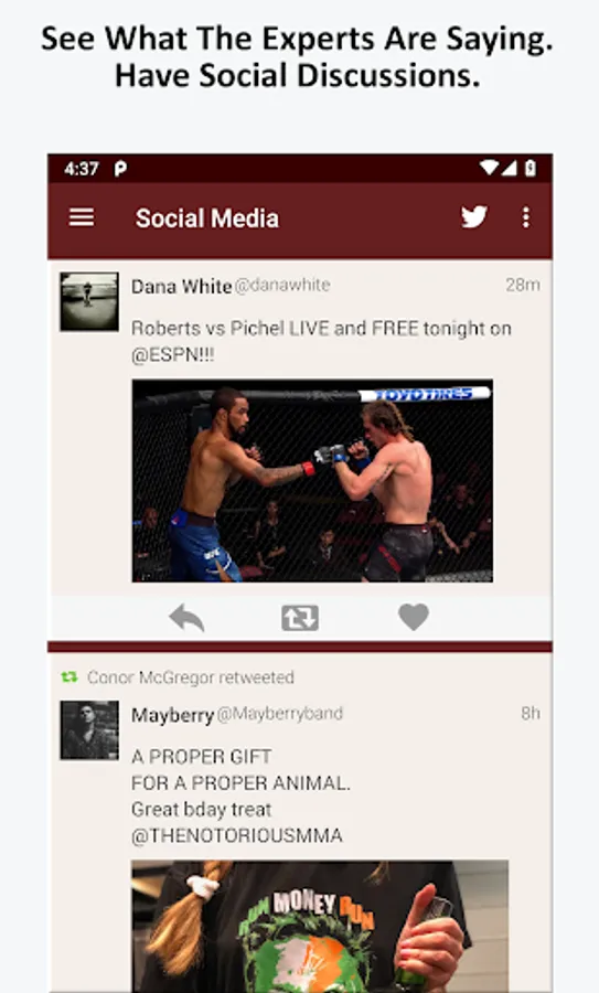 -- Discussion feed that aggregates fighters and personalities from the Mixed Martial Arts world into a single list of tweets, so you can hear what everyone has to say and respond to them in real-time.