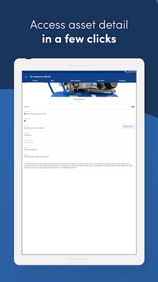 - Asset management: Keep track of all your organization's assets, including their location, condition, open work orders, and recent maintenance history.