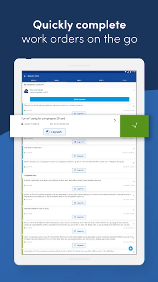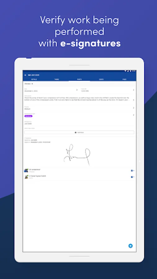 - E-signatures: Sign off on work orders directly on your device to streamline the approval process and eliminate the need for paper-based signatures.
