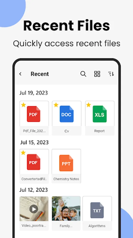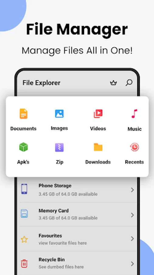 Manage all types of files in one place i.e. Downloads, New files, Videos, Audio, Images, Apps, APK, Docs, and Archives.