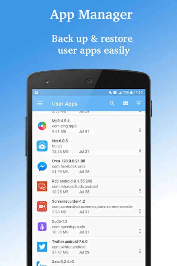 • Apps: You can see all applications installed in your local device. You can stop or delete apps. You can delete data or cash of apps. You can backup your app as apk file also.