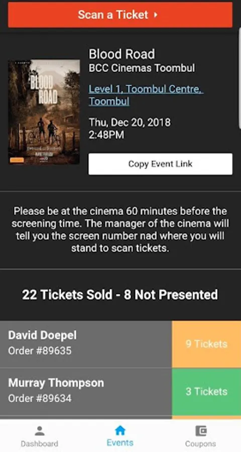 On the night, scan tickets as people arrive, see how many people are still to come and easily see when everyone is in the cinema.