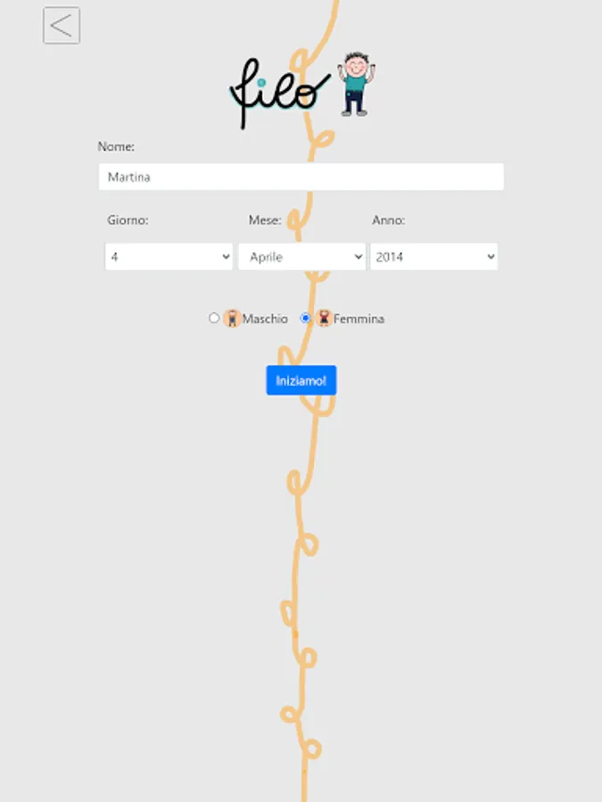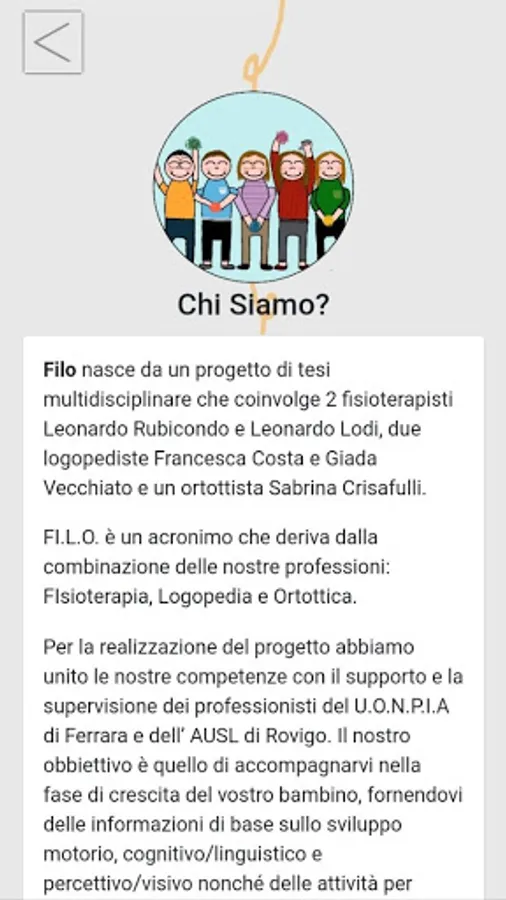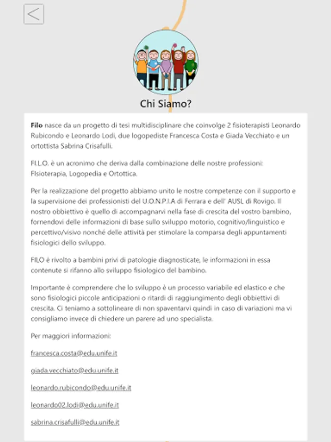 Filo was born from a multidisciplinary thesis project involving two undergraduates physiotherapists, two speech therapists and an orthoptist. It aims to inform the parent about the various stages of the child's growth, starting from birth up to 5 years of age. In addition to information describing growth, there are areas that describe specific activities for each stage of growth, in order to offer parents games and exercises aimed at developing specific areas in the child.