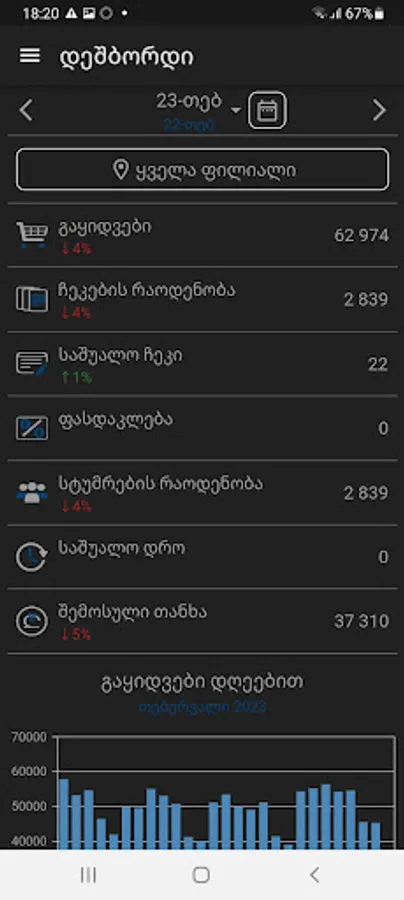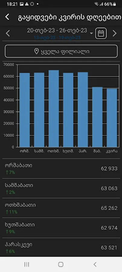 -Get graphical and table presentation of sales by stores, days, week days, categories, products, etc. for specified period