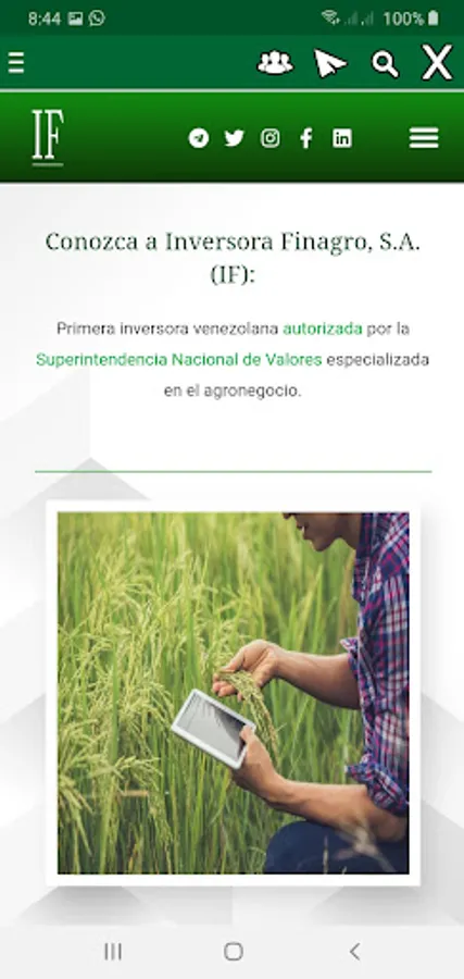 Finagro Móvil is a platform of Inversora Finagro, SA, which provides assistance to participants, investors and producers, through a simple and friendly interface, everything related to Agribusiness, with a financial vision from the capital market focusing on: securities agricultural securities, products or instruments in Venezuela and abroad.