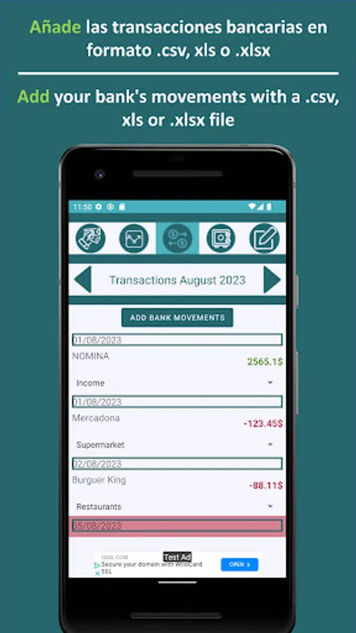 3) Download the monthly movements of your bank in .csv format and upload the file in the application