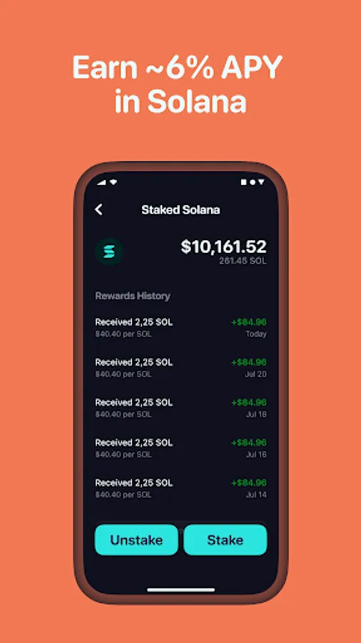 - Earn ~6% APY in Solana.