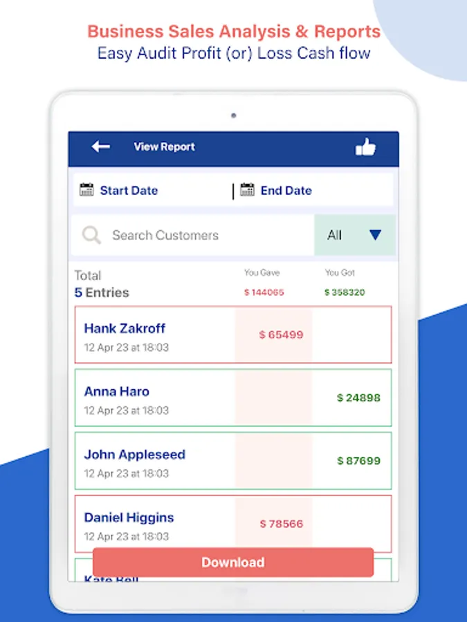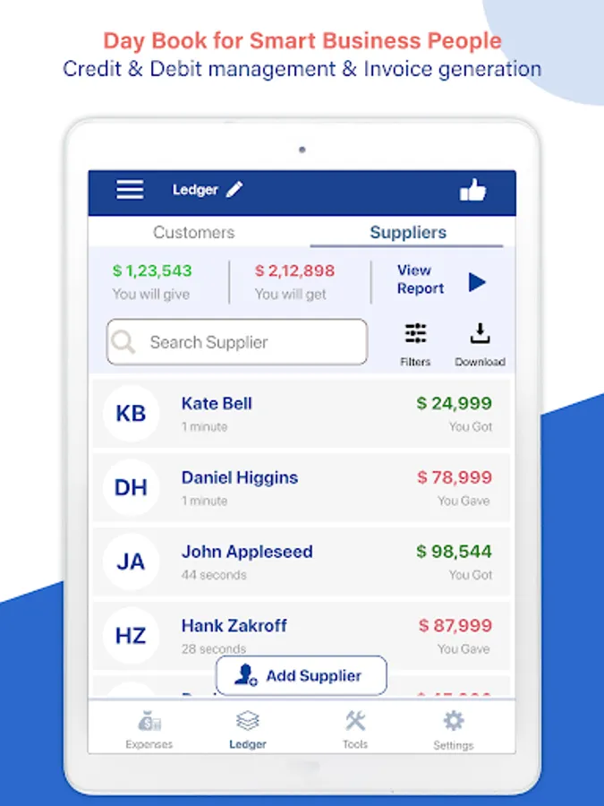 • Ledgerbook with Customers and Suppliers Support: Ledger Book Manager allows you to add multiple businesses profiles and track individual transactions with customers and suppliers.