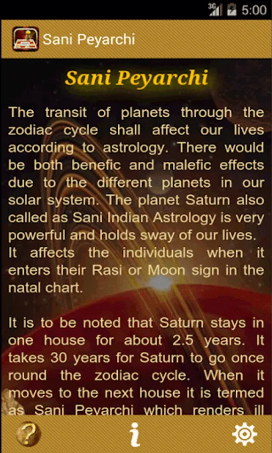 It is to be noted that Saturn stays in one house for about 2.5 years. It takes 30 years for Saturn to go once round the zodiac cycle. When it moves to the next house it is termed as Sani Peyarchi which renders ill effects for the natives. Saturn is a planet that is visible to the naked eye. It is noted for its beautiful rings around.