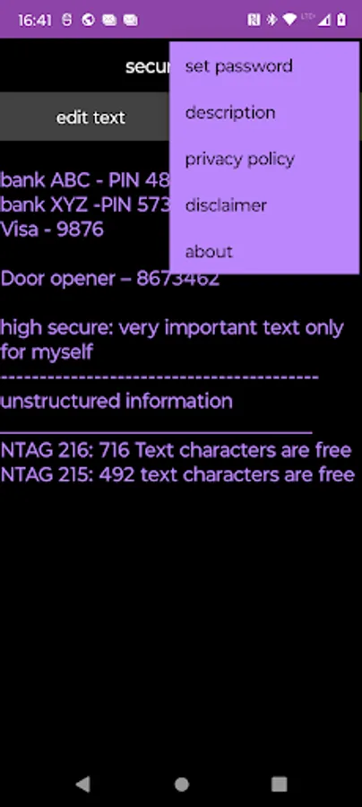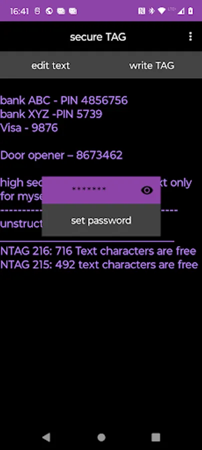 This application encrypts text (AES 128) that is entered directly into the app's input window - or inserted via drag & drop - and writes it onto low cost NFC TAG’s, NFC cards, or other NFC-devices.