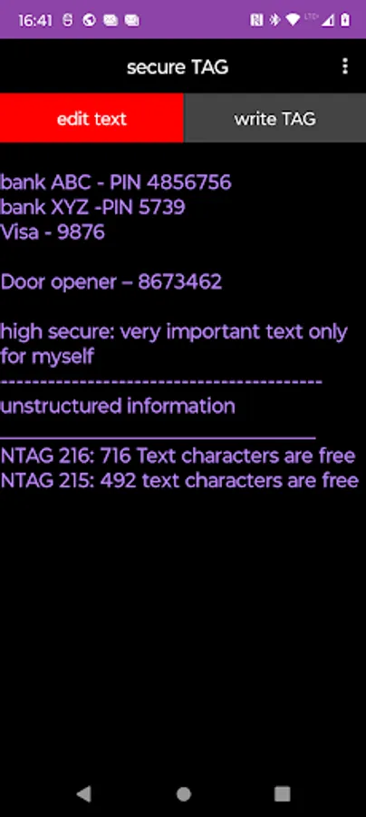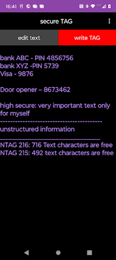 Any text can be stored in any text format up to the size of the tag type - similar to a notepad - but encrypted.