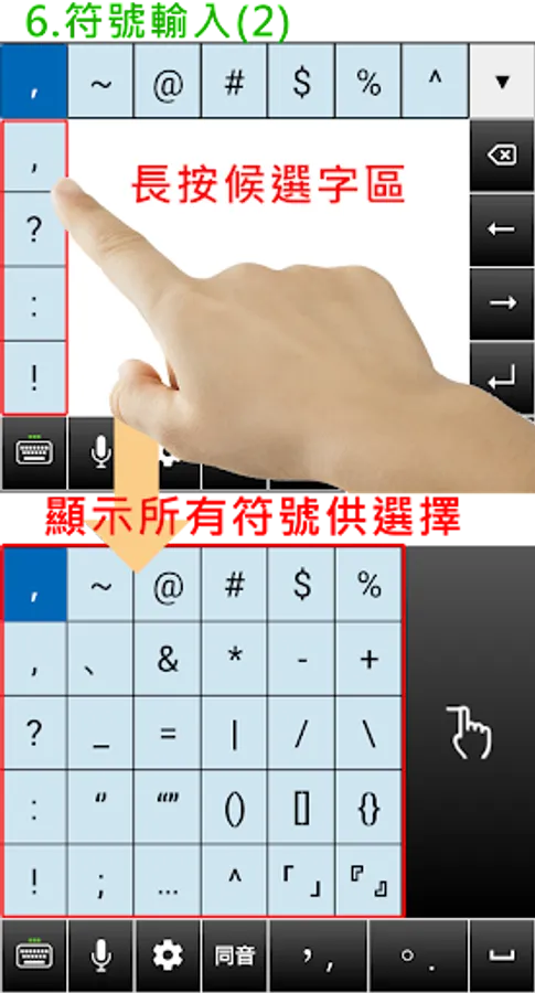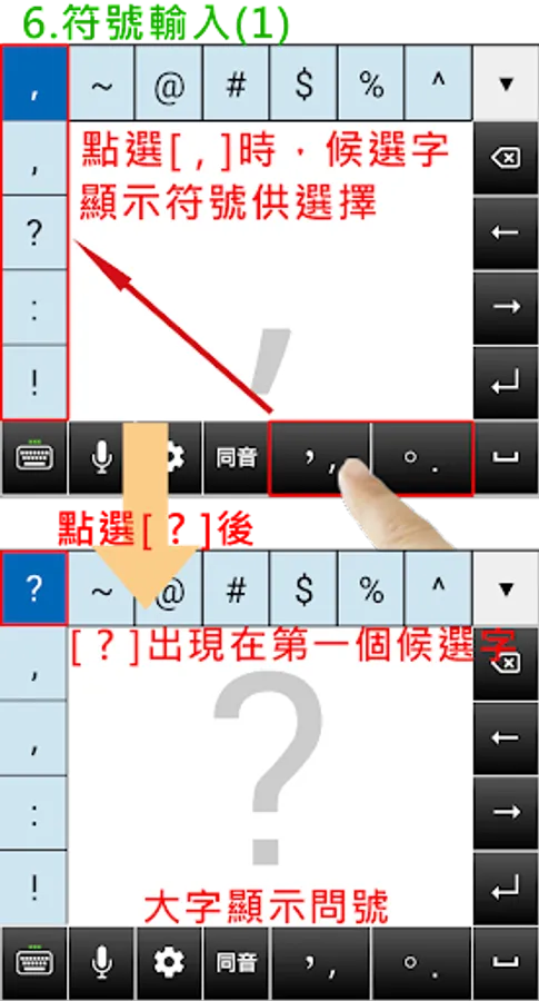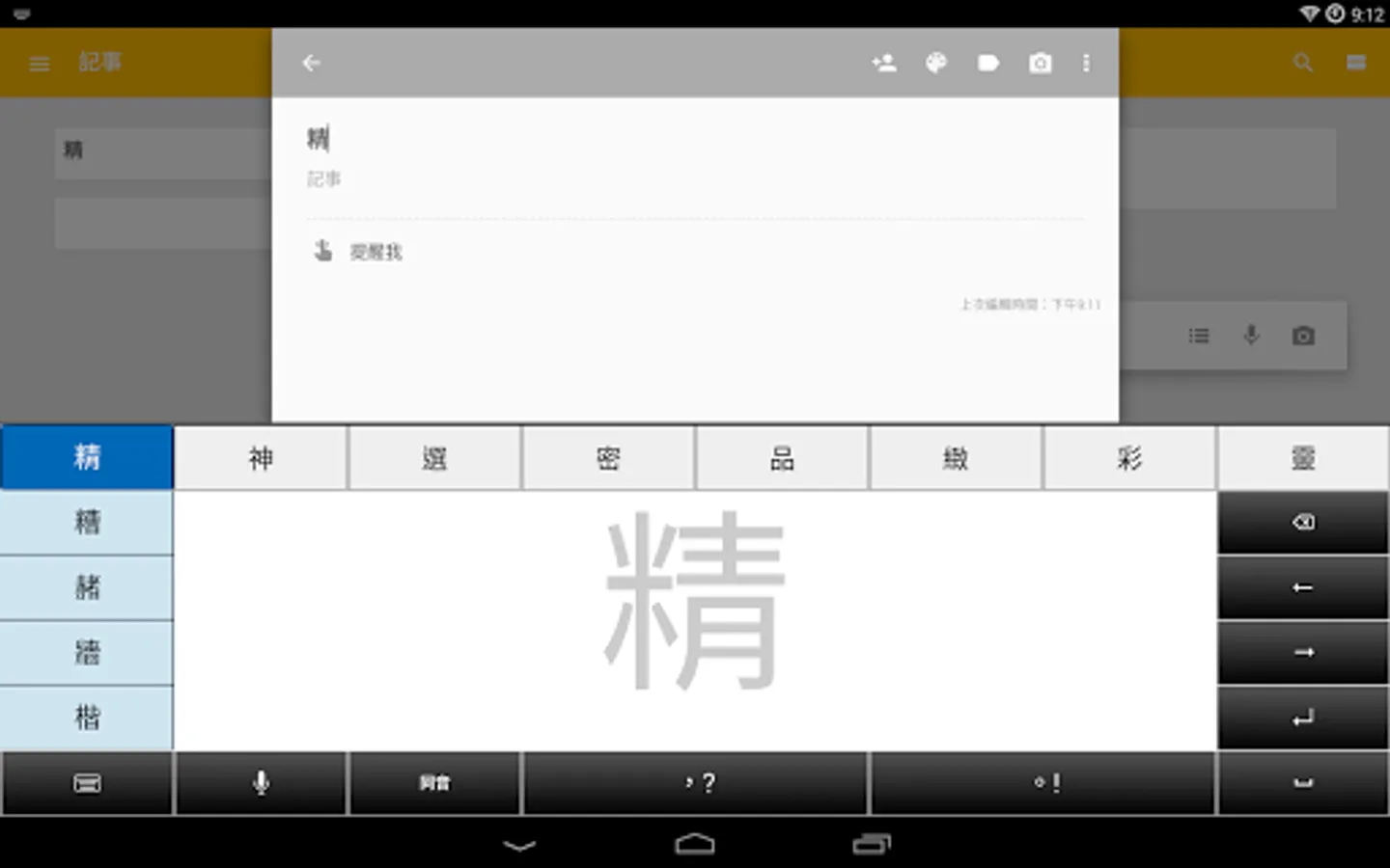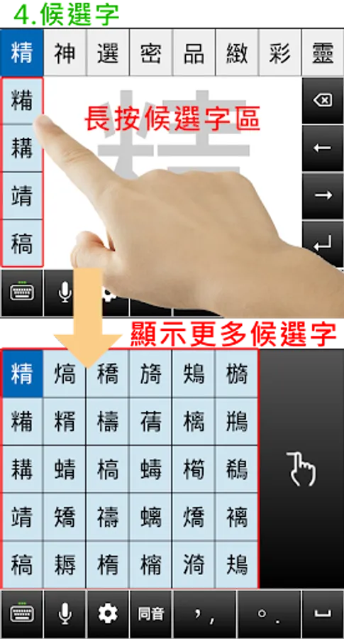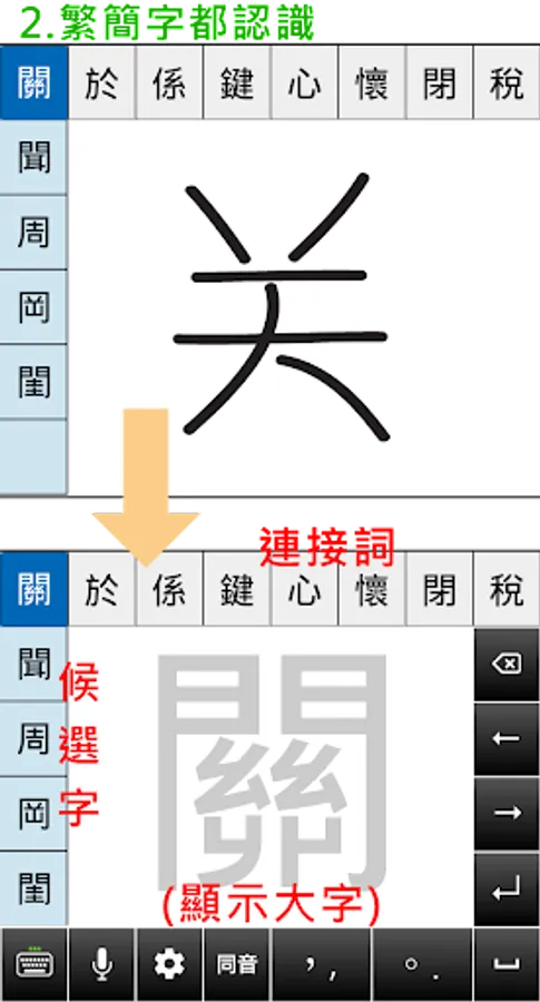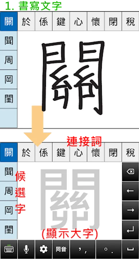 1.辨識出來的字以大字體顯示在書寫區,讓使用者清楚確認所輸入的字,避免因手機過小,看不清楚輸入字。