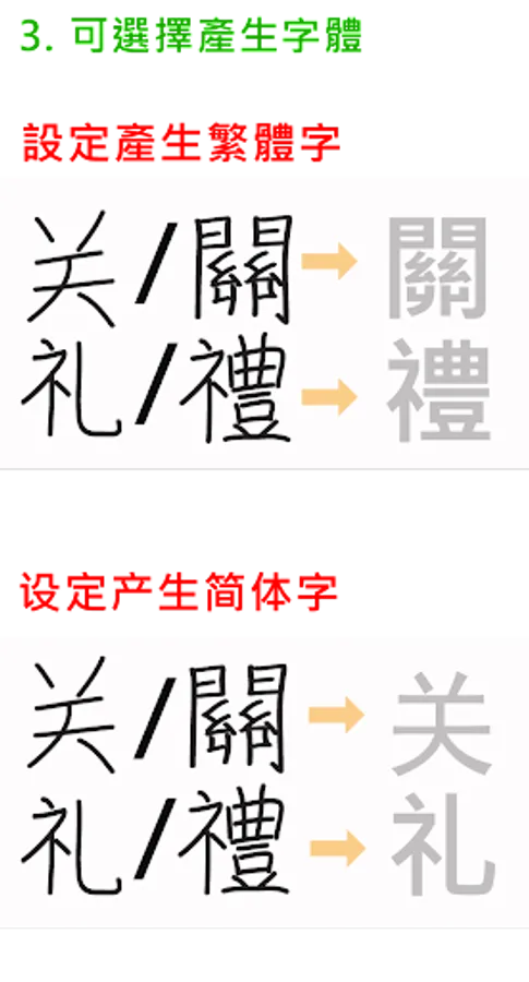 例如:設定輸出繁體:書寫(关/關)=>關,書寫(礼/禮)=>禮