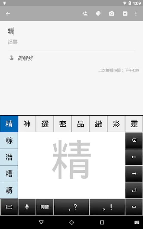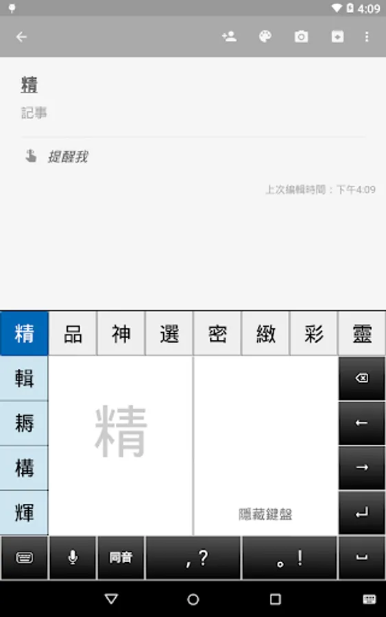 4.提供豐富的連接詞供點選,減省書寫字數。例如輸入[精]字後,會出現[品、神、選、密、緻…]等字供點選。