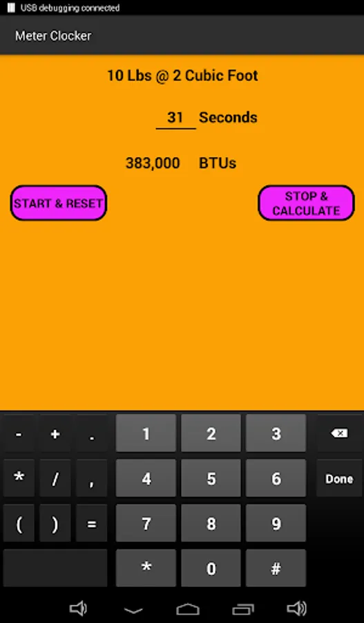 This app is design to calculate gas consumption on a meter. It can be used to check for inefficient appliances or total home or business consumption. It is design to work on pressure ranges: 7" water column, 2 psig, 5 psig, or 10 psig systems and meter index size 1/2 cu ft, 1 cu ft, 2 cu ft and 5 cu ft. Simply select your pressure then select your index measurement size and then enter the number of seconds to took to make 1 revolution then press calculate and it tell you how many BTU per hour are being consumed. You can now use this information to check against the rating plate on your appliance being tested to see if it under/over fired. Poorly running appliances can cost your hundreds of dollars and not to mention can be unsafe to operate.