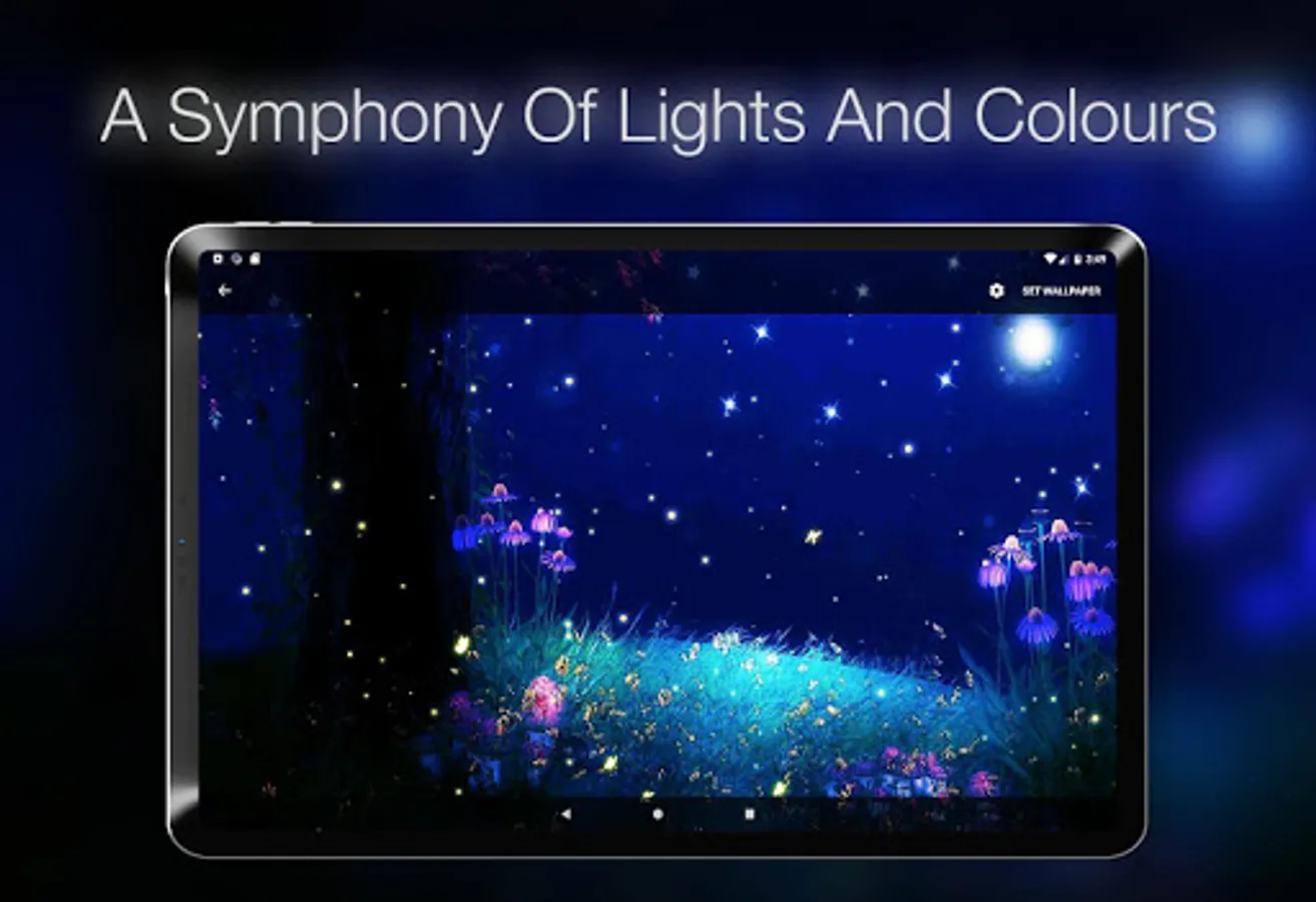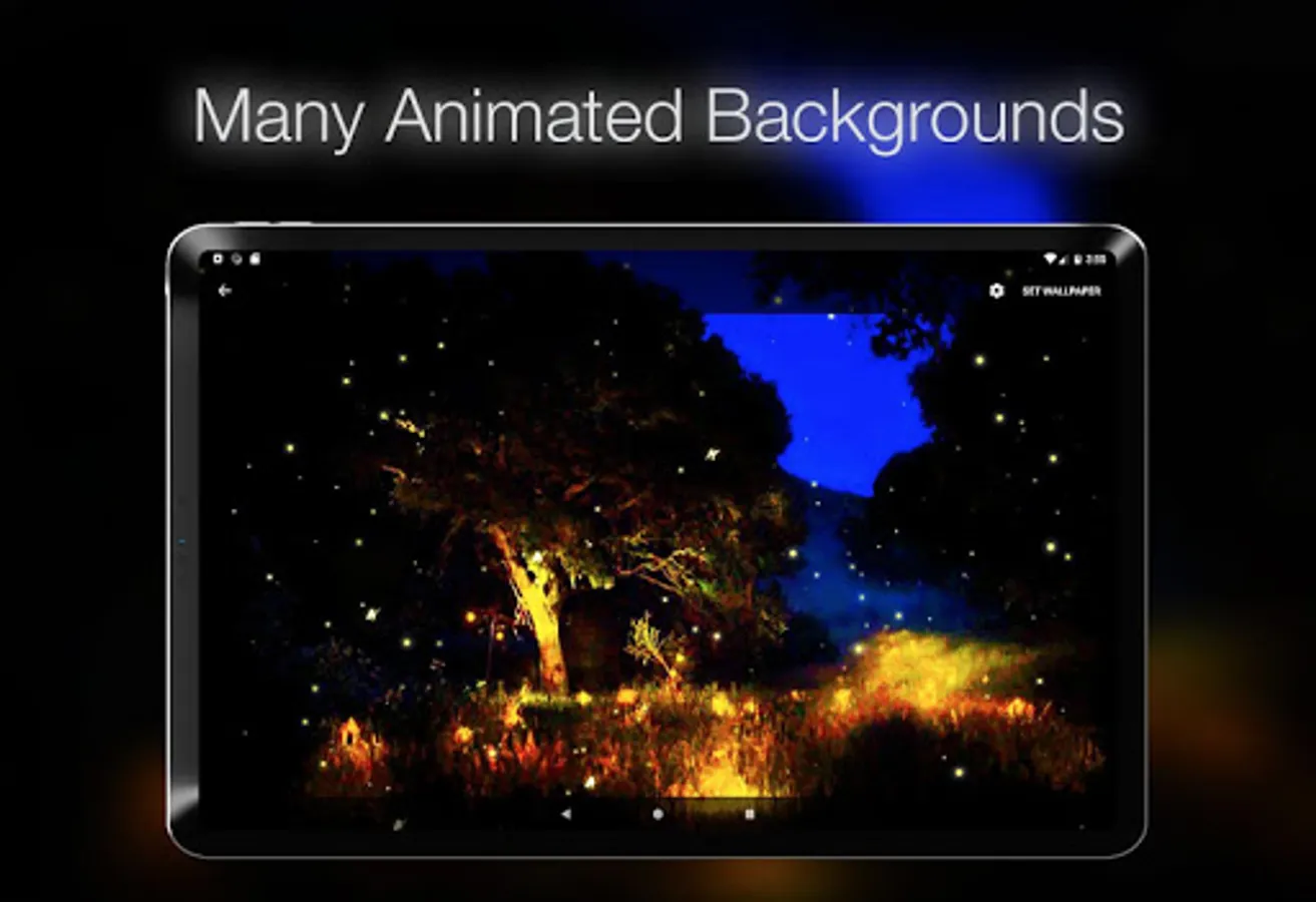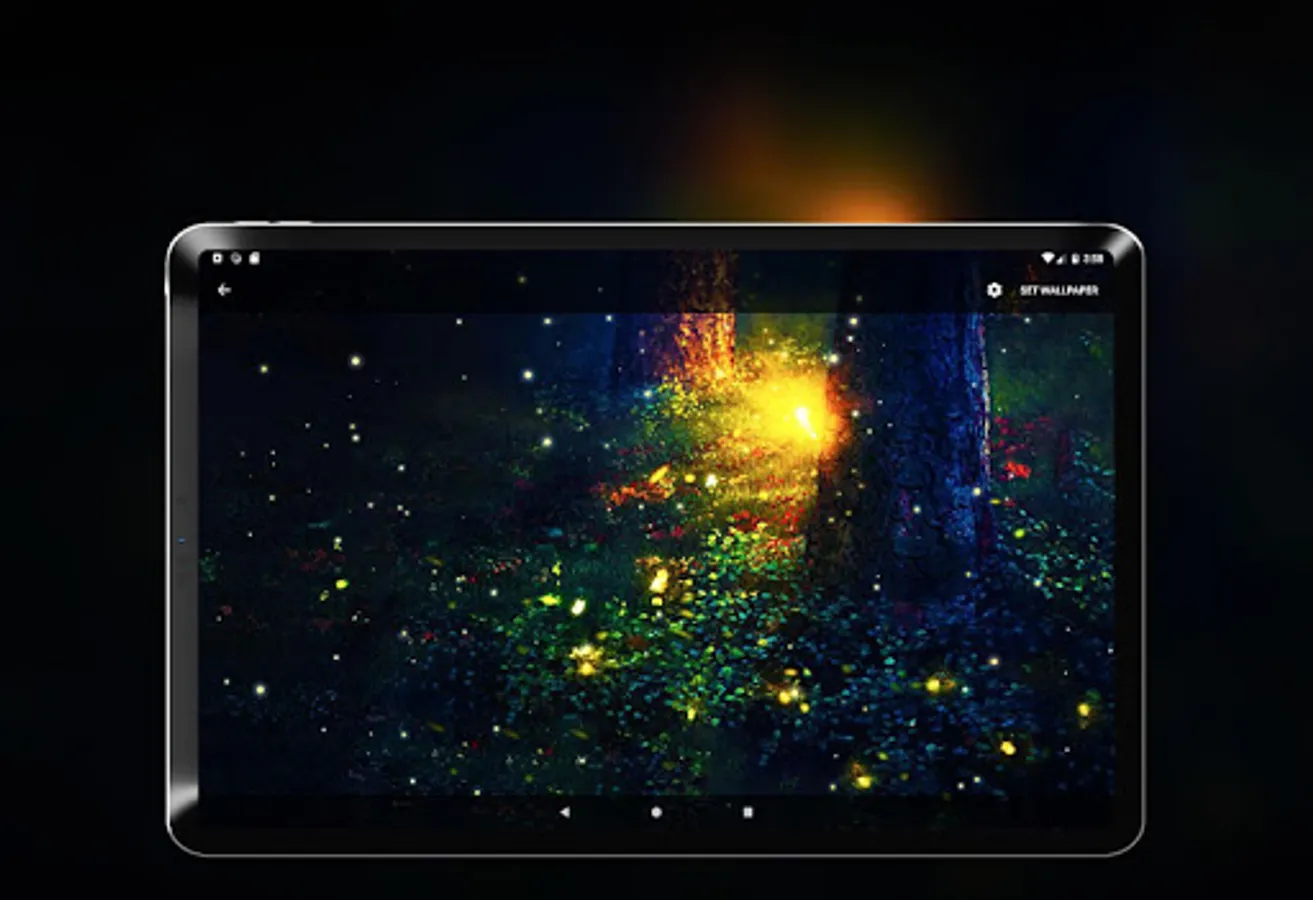 We present you a live wallpaper created for the joy of your sensations. A colorful scene full of fantasy that will let you dive on the spectacle of the nature played by fireflies and butterflies. You can activate also a relaxing forest sound that will totally make you jump into the summer night atmosphere. We simulated fireflies’ movement after carefully observing their natural behavior. The final spectacle is a true expression of the nature magic. The magical synchronous flash signals generated by fireflies are the source of a truly mystical show. You will experience a true sensation of peace and tranquility while watching your screen. The colorful flickering lights of fireflies and incandescent butterflies, comes with a set of 10 wonderful wallpapers that can be set as background. In this dreamlike scenario, you will find fireflies, magic butterflies and some stunning backgrounds from magical forest or enchanted forest. Download the fireflies animated background and let those shiny insects fly all over your screen.