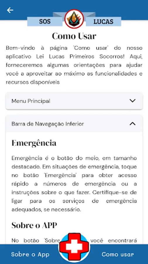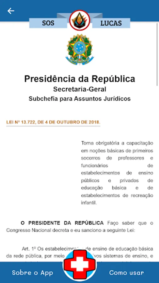 The "First Aid - Lucas Law" application is a project developed to provide didactic information on first aid, focusing on employees of educational institutions who have taken the Lucas Law course. The main objective of the application is to reinforce and remember the knowledge acquired in the course, not replacing the complete training.