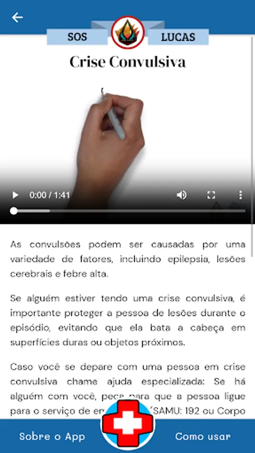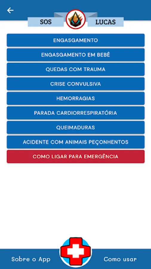 The application addresses several topics related to first aid, such as choking, choking in babies, falls with trauma, seizures, bleeding, cardiorespiratory arrest, burns and accidents with venomous animals. In addition, it provides a brief explanation of how to call emergency services.