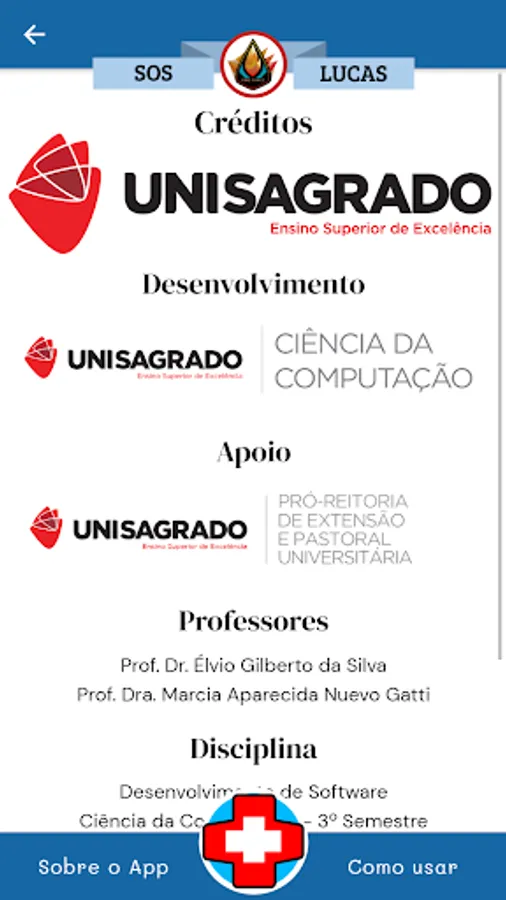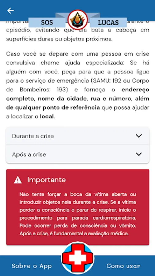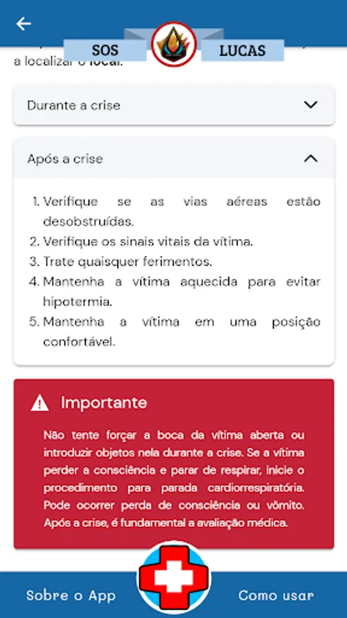 In summary, the "First Aid - Lei Lucas" application seeks to provide a practical, educational and easily accessible tool to assist in the provision of first aid, recalling important knowledge and promoting a quick and efficient response in emergency situations.
