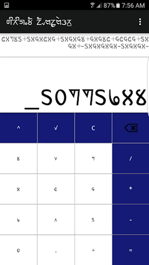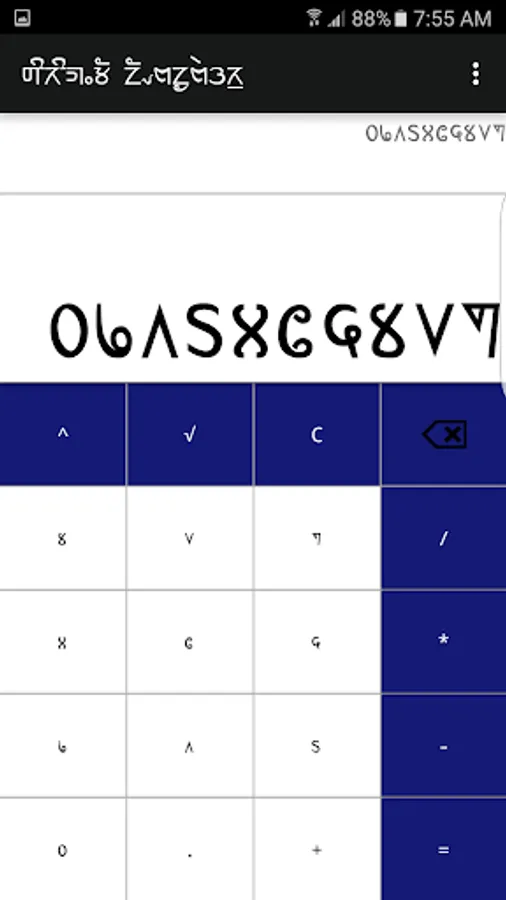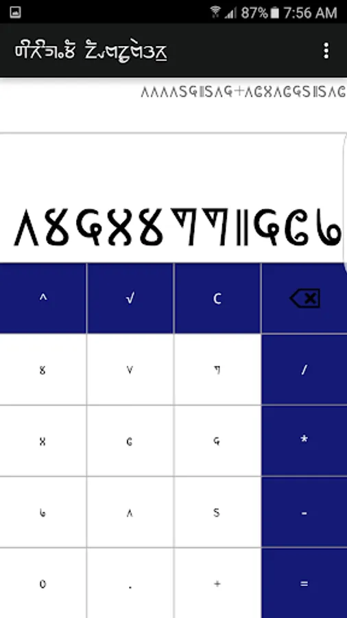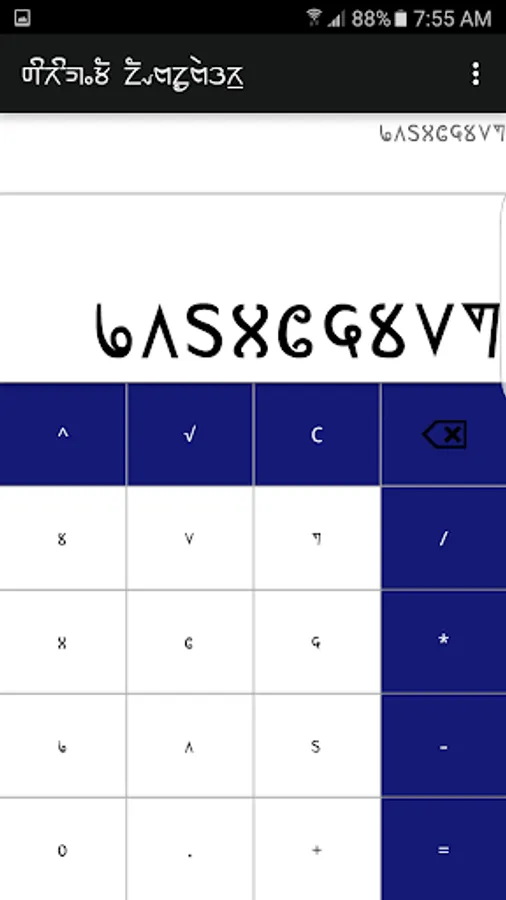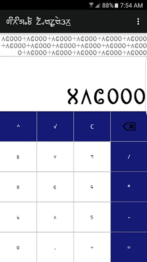 Sirijunga Calculator use Sirijunga numeral format to calculate. It's a simple calculator featuring addition, subtraction, multiplication, division, square root and power. The keypads are all labelled in Sirijunga numeral format and the display view consists of two number format view. The upper one is Sirijunga number system which shows the total numbers entered along with operators and below is Sirijunga number system which display the total sum.