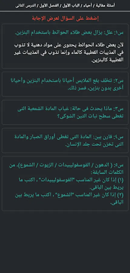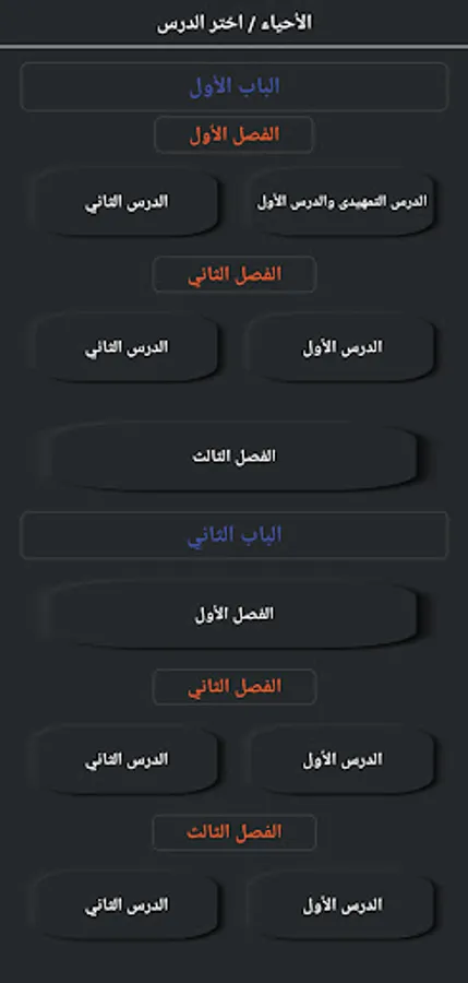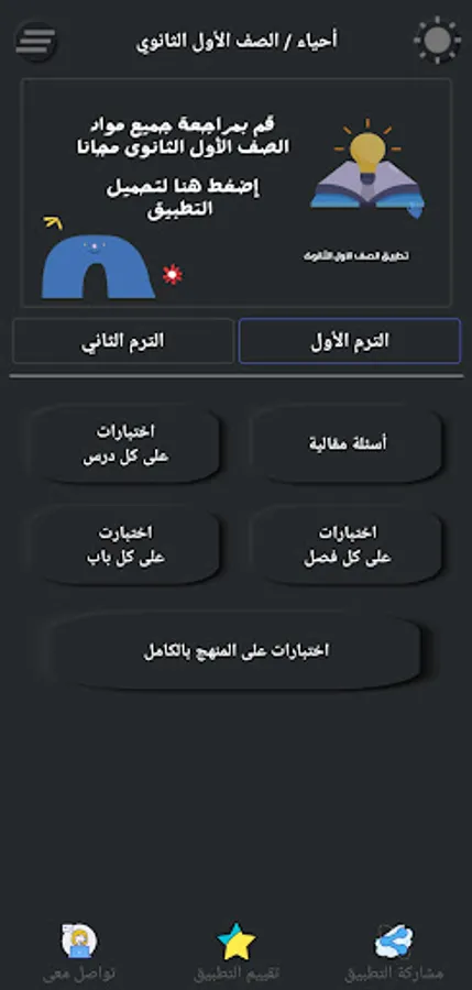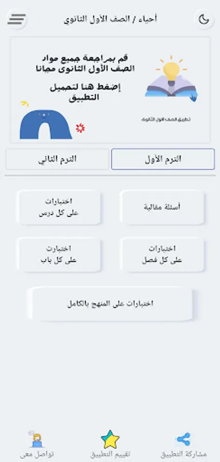 In the biology application for the first grade of secondary school, you will be able to review your lessons first through a number of questions for each lesson, and there are also full exams on all units