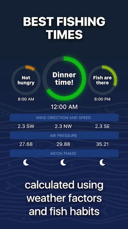 Whether you enjoy bass fishing, trout fishing, fly fishing, ice fishing, offshore fishing, deep sea fishing, boat fishing, line fishing or any other kind of fishing, you will find our fishing forecast app indispensable!