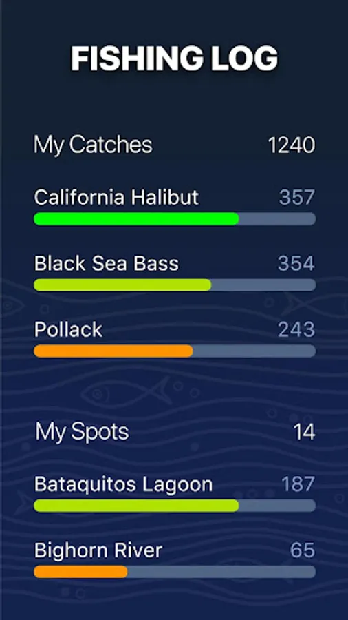 - Save up to 20 favorite fish spots and see the fishing statistic and forecast for them.