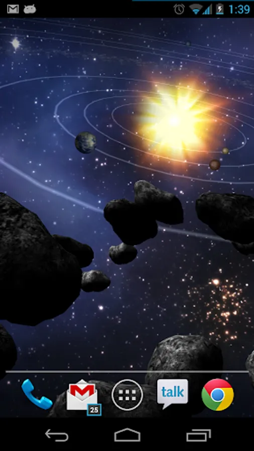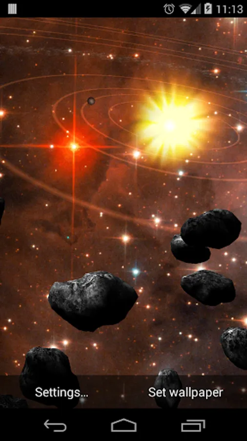 A beautiful 3D live wallpaper featuring a planetary system and tumbling asteroids! The planets move based on the time of day! Has proper support for home-screen switching, and supports both portrait and landscape mode! Works as a Daydream on 4.2+ devices!