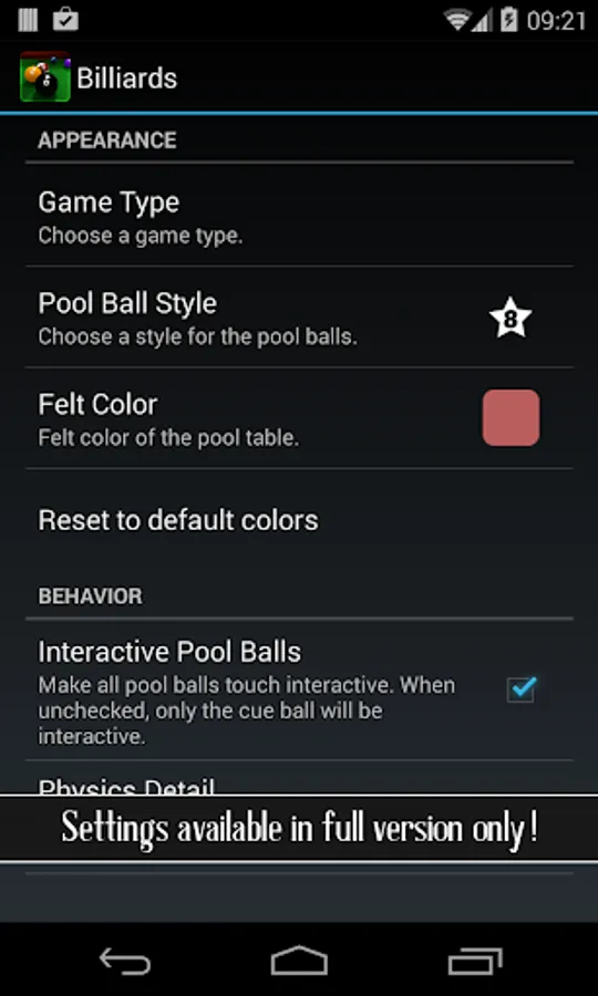 If you enjoy this, please support us by buying the full version! It has a full settings screen, allowing full control of all balls on the table, and giving control over felt color and ball appearance, in addition to the game layout you prefer! Plus, adjust physics accuracy for your individual device!