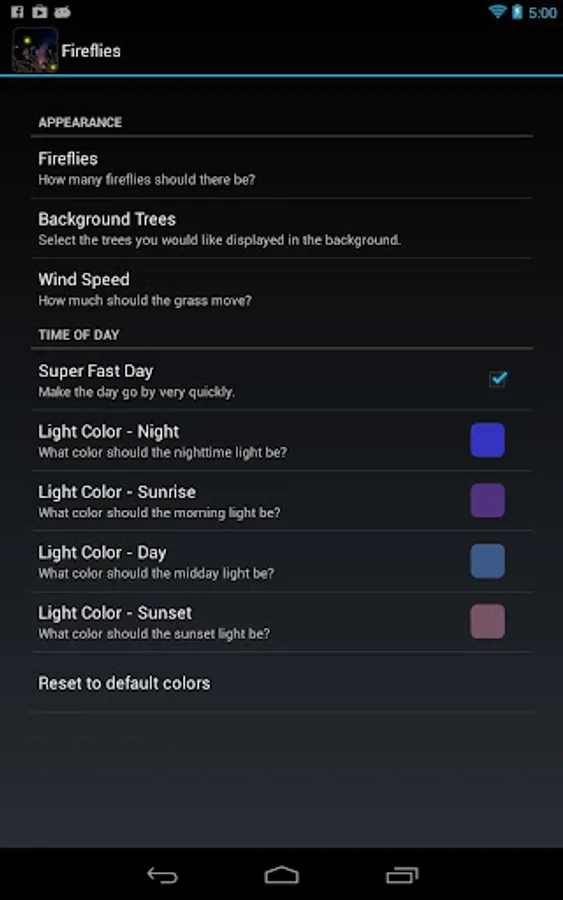 This full version has a complete settings screen, allowing you to enable time of day color changing, modify the number of fireflies, change the background image and more!