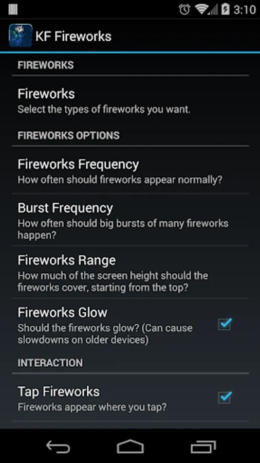 This full version has a complete settings screen! Choose which types of fireworks are launched, whether they appear upon touch, how often they should launch, which background image you prefer, and more. Fully supports both phones and tablets, in either portrait landscape mode. Works as a DayDream on 4.2+ devices!