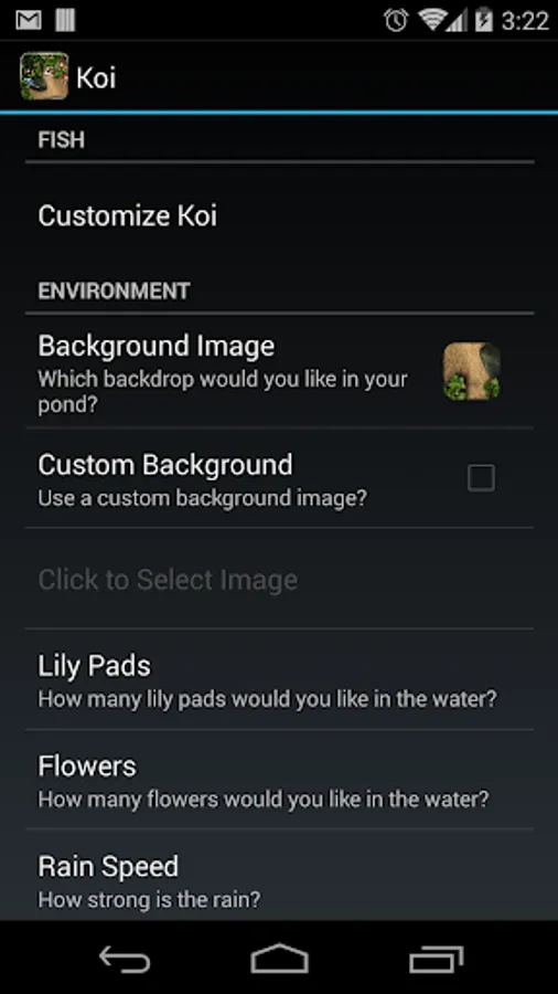 This full version has access to the settings screen, with controls for your fish population, background image, raindrops, time of day, and more. Add lily pads to the water surface, or provide your own custom background!