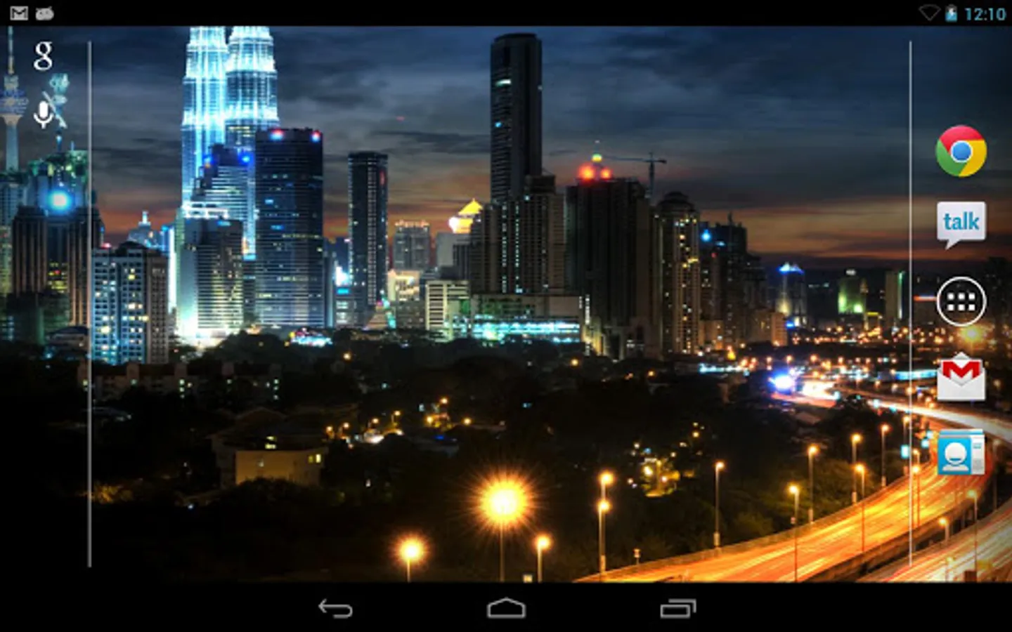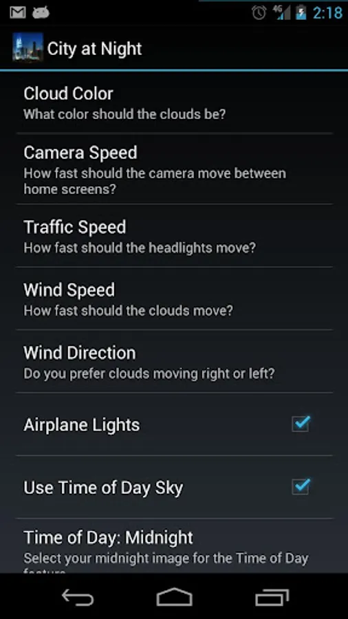 Moving clouds and streaks from the traffic enhance this beautiful long-exposure image of a city at night. Has full support for both portrait and landscape viewing, and responds to home screen switching! Lots of preferences for speeds, sky colors, time-of-day cycling, and more.