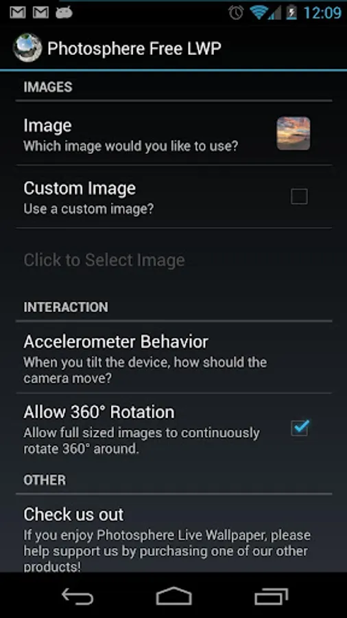 If you enjoy this, please help support us by checking out our other products, or get the paid version of Photosphere Live Wallpaper! This free version has one ad, displayed on the settings screen, and no other limitations.