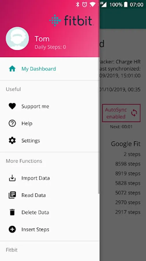 With the AutoSync feature, the steps can be automatically transferred from your Fitbit account to Google Fit. If you prefer manual synchronization, the reminder function helps you to remember this. Both functions can be activated under the menu item "Settings" when required. The AutoSync function allows you to choose between different intervals.