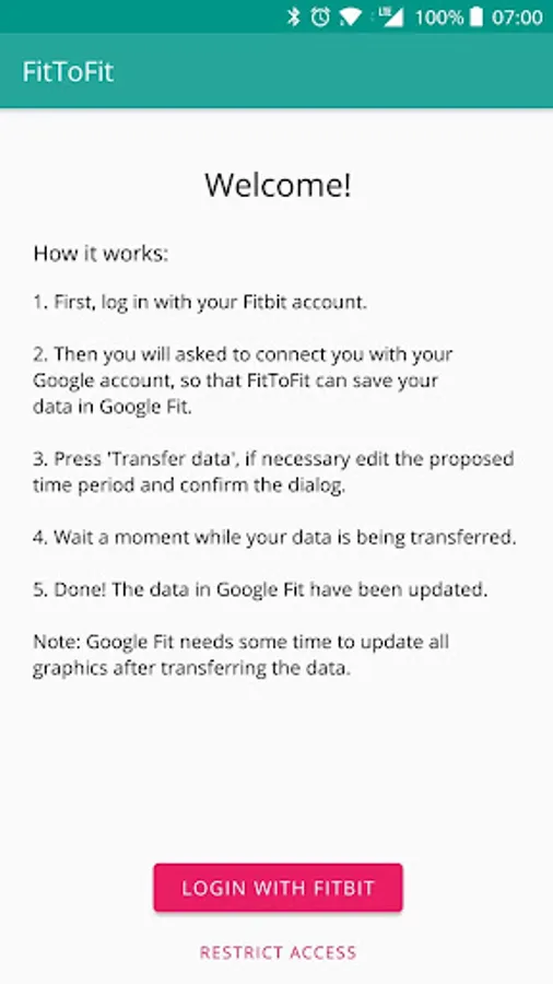 FitToFit allows you to transfer your fitness data from Fitbit to Google Fit. The data is queried directly from your Fitbit account and inserted into Google Fit. To do this, you must first log in with your Fitbit account and give FitToFit access to the data that you want to transfer. You will then be asked to connect to your Google account, into which the data from Fitbit should be inserted. FitToFit uses the access and your data exclusively for the transfer from Fitbit to Google Fit. Your data is not stored outside of Fitbit and Google Fit.