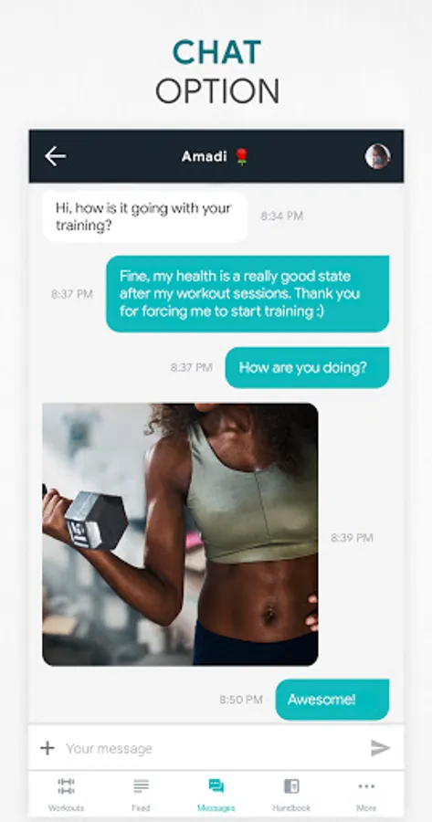 - Direct message our coaches using the built-in chat feature. Send recommendations to your friends and help them lose weight, get perfect abs, workout arms and chest, maintain a healthy diet.