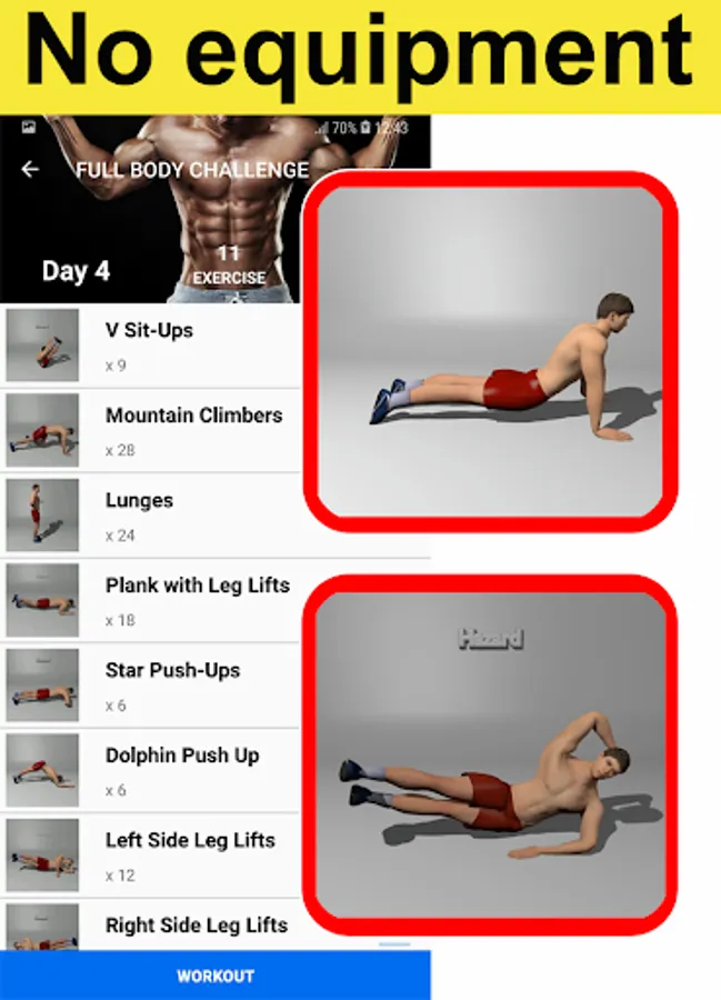 Home Workouts No equipment Pro provides daily workout routines for all your main muscle groups. In just a few minutes each day, you can build muscle and exercise at home without having to go to the gym. No equipment or coach needed, all exercises can be done only with your body weight.