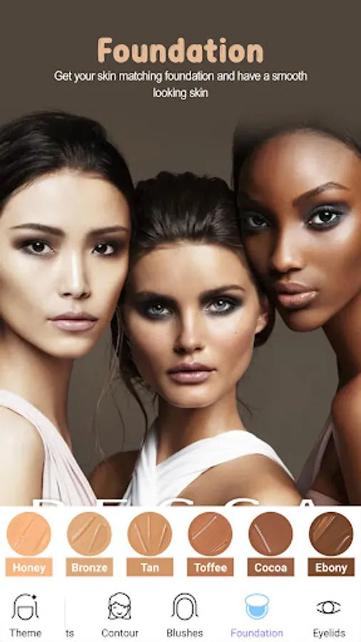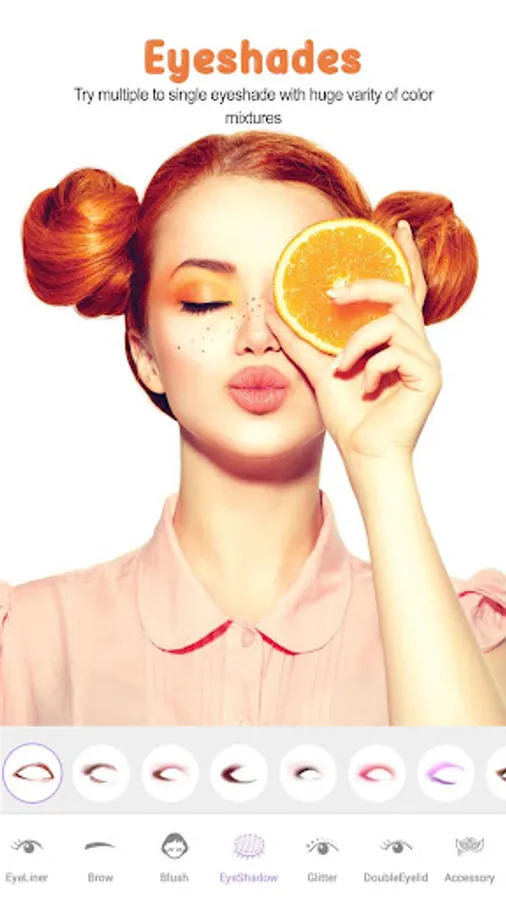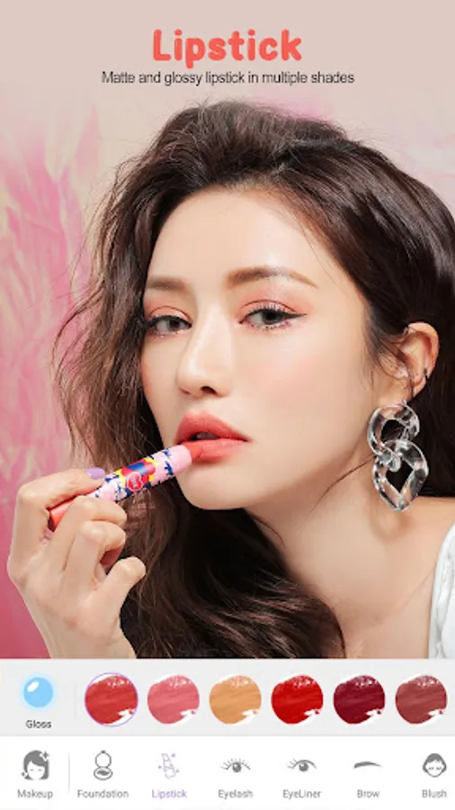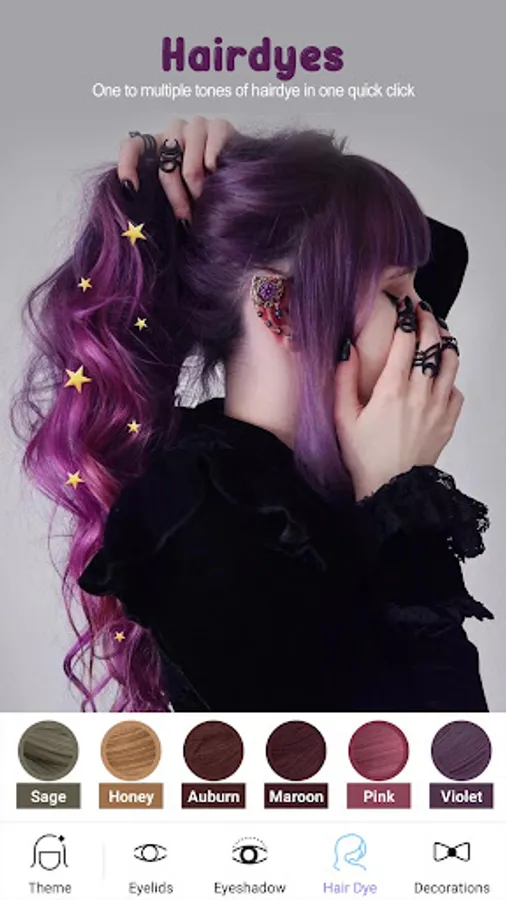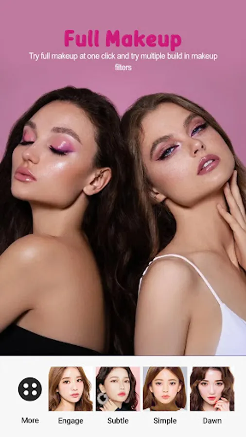 Apply numerous makeup filters and effects on your selfies and photos to enhance your looks, use different mascaras, lipstick, eyeshades, blushes, colorful lenses, various hair colors, foundations, etc.