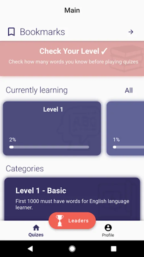 Don't forget to take a small 'Check your level' quiz! You will test your current vocabulary size, so you can better understand how many words you still need to learn!