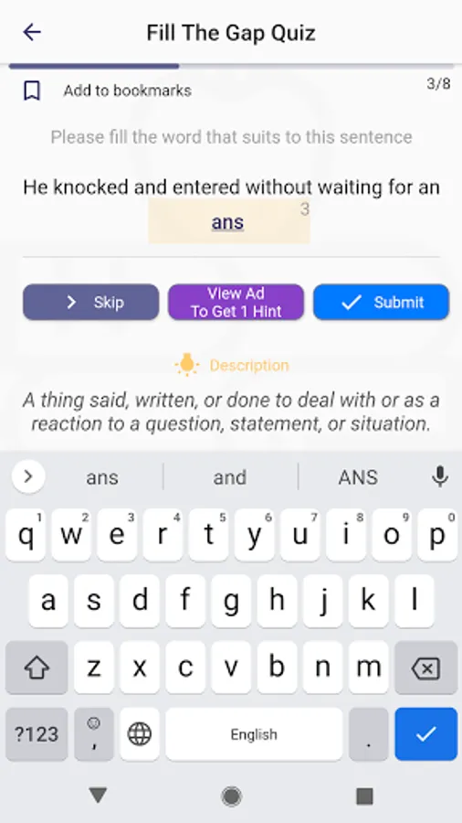 In this trivia, you need to finish the sentence or fill the gap with an appropriate word. A certain number of hints are given to you based on the word complexity. Each of them opens 1 letter of the English word you need to fill. To understand the context and learn the word, the 'Fill The Gap' quiz provides the description and word usage example.