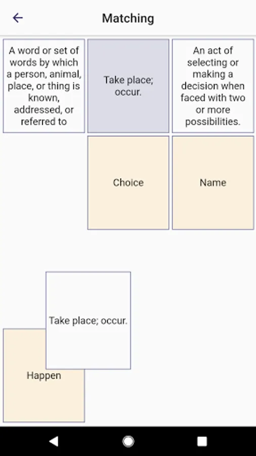 Here you need to correspond the English word with its description or a usage example. Just drag-and-drop the word tile over the description tile to check, whether you are right.
