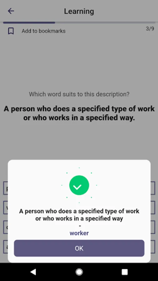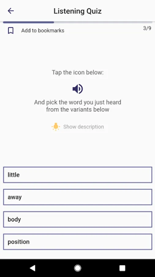 Increase your English vocabulary with the right pronunciation of the word and boost your skills. Tap on the 'listen' button and choose the word you've just heard from the provided variants.