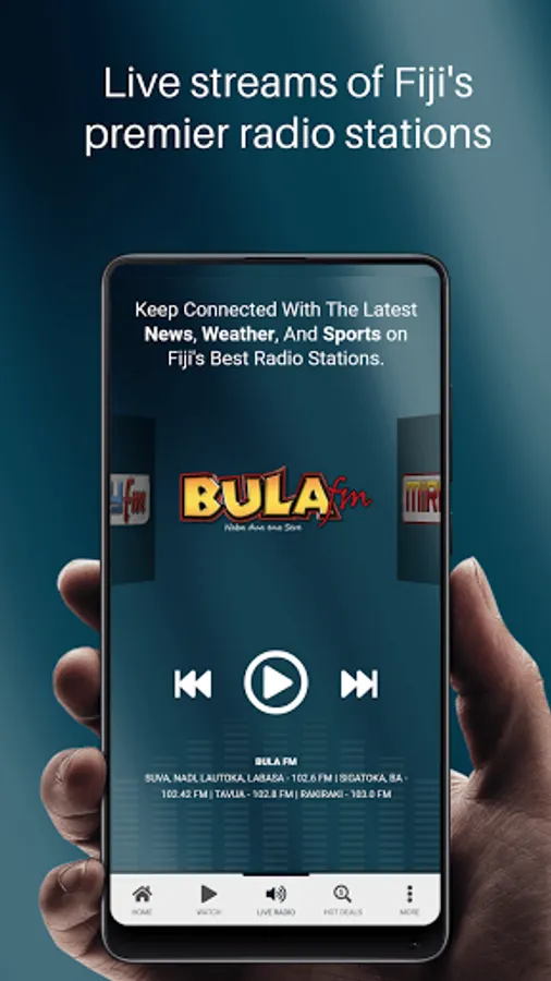 Listen - Live streams of Fiji's premier radio stations: Bula FM, Mirchi FM, Gold FM, 2DAY FM, Radio Fiji One, and Radio Fiji Two.